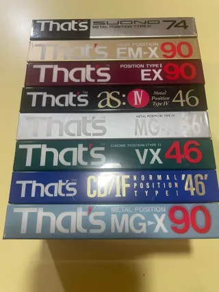 Lotto di 8 audiocassette vergini marca That's. - That's SUONO 74 METAL POSITION TYPE IV - That's EM-X90 HIGH POSITION - That's EX90 POSITION TYPE II - That's AS:IV Metal Position Type IV 46 - That's MG-A46 METAL POSITION TYPE IV - That's VX46 CHROME POSITION (TYPE I) - That's CD/IF NORMAL POSITION TYPE I '46' - That's MG-X90 METAL POSITION