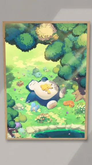 Poster raffigurante Pikachu e Snorlax in un paesaggio naturale. Poster a3 con 200g carta spessa - Personaggi Pokemon: Pikachu, Snorlax, Squirtle, Charmander, Bulbasaur. - Ambientazione: prato verde con alberi e laghetto.