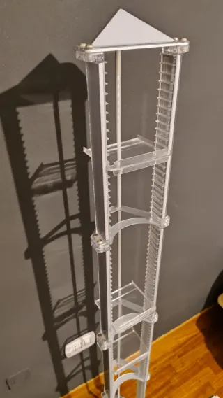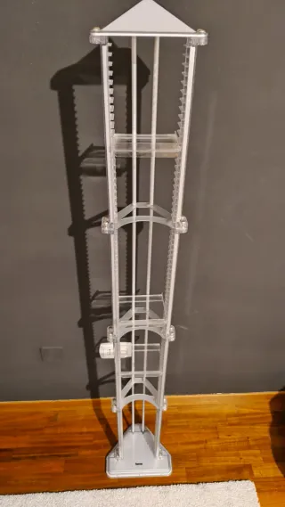 Elegante porta CD a torre girevole, perfetto per organizzare la tua collezione musicale o di film. - Struttura in plastica trasparente e metallo. - Design a torre girevole per un facile accesso. - Ideale per CD e DVD.