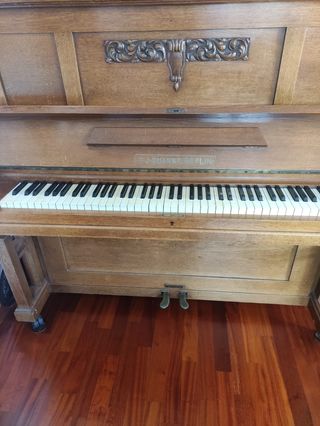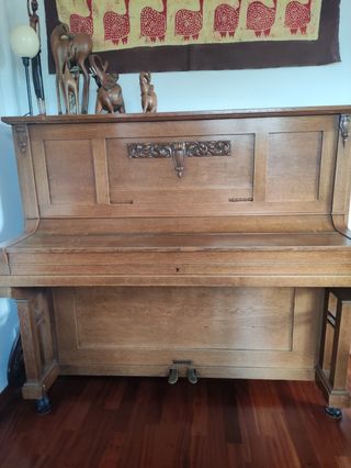 Piano verticale in legno J. Schiller. Uno strumento classico con un design elegante. - Finitura in legno scuro. - Tastiera bianca e nera.