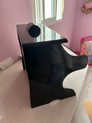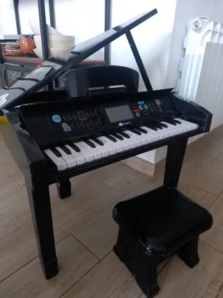 Piano giocattolo con design a coda, ideale per i più piccoli. Include un sgabello. Colore nero brillante. Tastiera bianco e nero. Include sgabello abbinato.