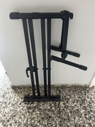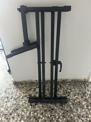 Supporto a doppio livello per tastiere musicali. Il suo design permette di posizionare due tastiere in modo sicuro e stabile. Con costruzione robusta in metallo nero, altezza e larghezza regolabili, pieghevole per facilitare il trasporto e lo stoccaggio.