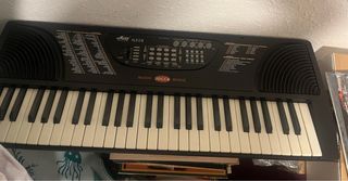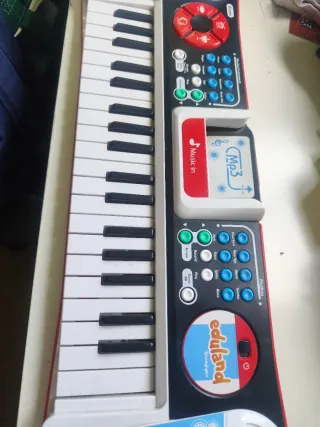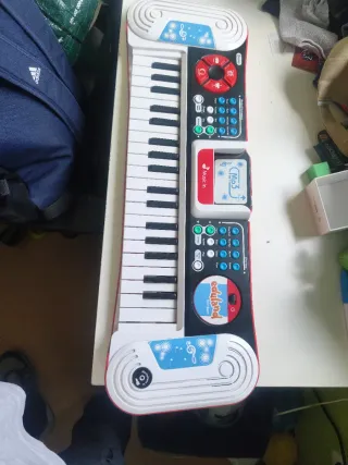 Tastiere musicali di colore rosso con un design divertente e a stella. Manca il coperchio delle batterie. Include microfono. Teclas bianche e nere.