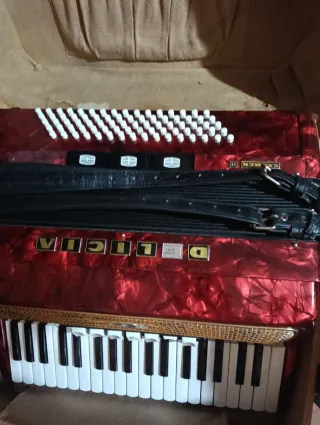 Fisarmonica di colore rosso con dettagli dorati e neri. Presenta un design classico ed elegante. - Tastiera bianca e nera. - Pulsanti bianchi sul lato sinistro. - Targa con il nome DELICIA in dorato.