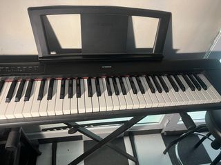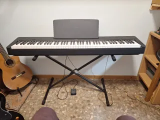 Piano digitale Yamaha P45 in colore nero. - Tastiera con 88 tasti controbilanciati. - Include supporto per spartiti. - Include pedale di sustain. - Include alimentatore. - Include supporto pieghevole per pianoforte. - Include sgabello.