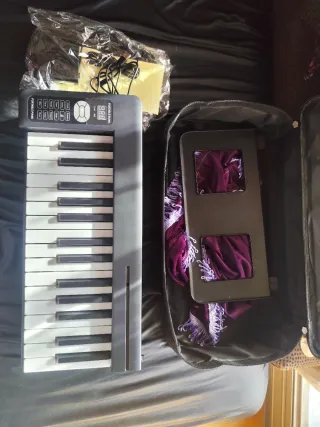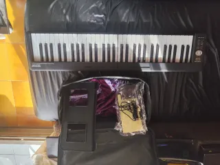 Piano elettrico portatile con design pieghevole e tasti illuminati di dimensioni reali. Include melodie per imparare e controllo di vari parametri. Accessori per l'uso e custodia inclusa. Usato due volte per prova e riposto nella sua custodia. - Tastiera pieghevole. - Tasti con funzione luce. - Include cavi, pedale e cuffie.