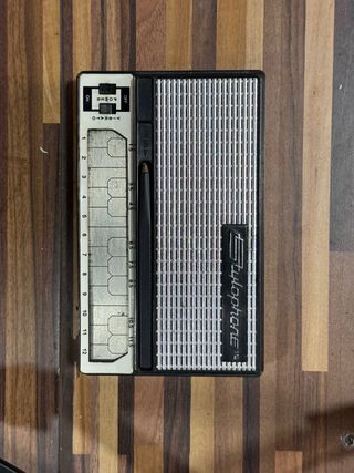 Strumento musicale elettronico Stylophone 350-S. Funziona bene ma un po' usato. Design compatto e portatile. Include stilo ottico. Pulsanti di accensione e vibrato.