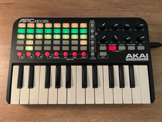 Controller MIDI Akai APC Key25 con tastierino da 25 tasti. Design compatto e portatile. Pad retroilluminati per il controllo di clip e scene. Pulsanti di trasporto e controlli dei parametri. Connessione USB per alimentazione e dati. Funziona perfettamente. Adatto per Ableton o qualsiasi DAW per produzione o live.