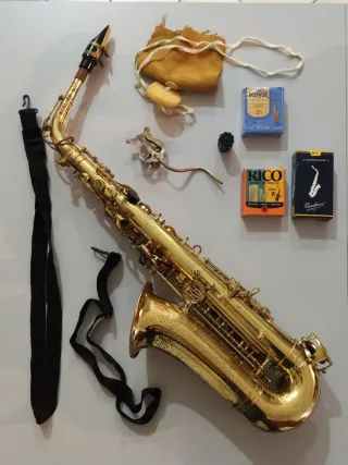 Sassofono Roy Benson AS 202 in buone condizioni, completo di accessori. Lo strumento è perfettamente funzionante ma ha una leggera ammaccatura sul lato basso e ci sono diverse macchie di ossidazione che non pregiudicano la funzione. - Custodia rigida imbottita. - Bocchino. - Legatura. - Copri bocchino. - Panno per pulizia. - Reed Rico (2.5). Supporto treppiede in omaggio !!!