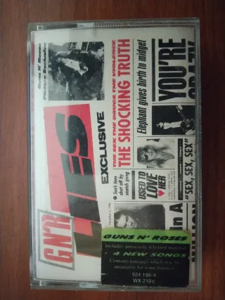 Cassetta GN'R Lies dei Guns N' Roses con la riproposizione dell'Ep di esordio della band di Axl Rose e Slash Live like a Suicide e quattro nuovi brani acustici, tra cui Patience. Con sticker in copertina. Musicassetta in edizione tedesca. - Include materiale precedentemente pubblicato. - Contiene 4 nuove canzoni. - Contains language which may be unsuitable for some listeners. - Codice: 924 198-4 WX 218 c