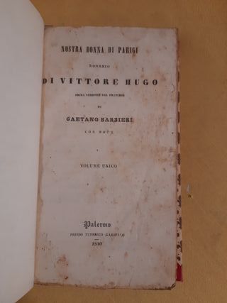 Edizione italiana del romanzo Nostra Donna di Parigi di Victor Hugo. Vittore Hugo: Nostra Signora Di Parigi - Gaetano Barbieri. Palermo Presso Federico Garofalo 1840 Prima Versione dal francese. Macchie ingiallimento, fioriture, due piccoli buchi come da foto - Prima versione dal francese. - Traduzione di Gaetano Barbieri. - Volume unico con note. - Pubblicato a Palermo nel 1840. - Stampato presso Federico Garofalo.