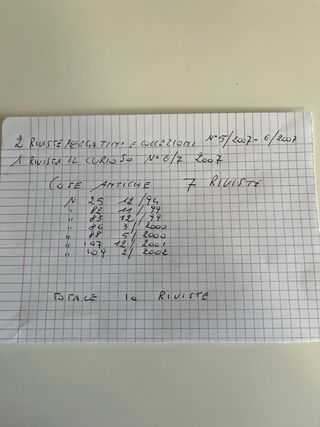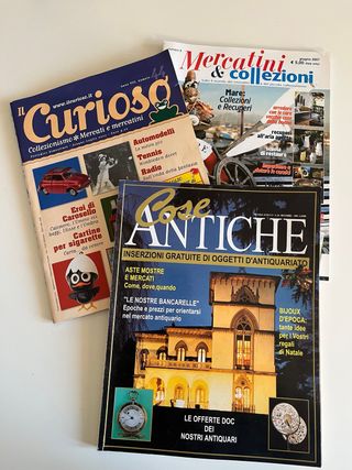 Due riviste, mercatini e collezioni una il curioso e sette riviste cose antiche e totali 10 riviste inclusa, una foto dove viene descritto i numeri e le date di ciascuna