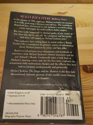 Celebre biografia di Michael Jackson scritta da J. Randy Taraborrelli, edizione Headline (1994). Il libro è in lingua inglese ed è considerato uno dei testi più completi e documentati sulla vita del Re del Pop.Un pezzo immancabile per i fan di MJ e per chi vuole approfondire la storia della musica pop degli anni '80 e '90.