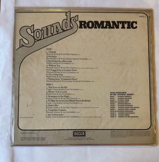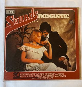 LP originale Decca – Sounds Romantic (serie Sounds), stereo 33 giri. Raccolta easy listening / orchestrale con artisti Decca come Ronnie Aldrich, Mantovani, Stanley Black, Frank Chacksfield e Werner Müller. Condizioni ECCELLENTI: – Vinile: eccellente, molto lucido, ottima resa sonora – Copertina: eccellente, ancora nella plastica protettiva originale – Inner sleeve originale non presente (fornita busta protettiva) Catalogo MOR 2, stereo. Ideale per appassionati di easy listening, mood music e vinili vintage ben conservati.