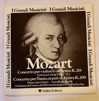 Vendo LP originale della collana “I Grandi Musicisti” – Fabbri Editori, numero 17, dedicato a W. A. Mozart. Contiene: • Concerto per violino e orchestra in La maggiore K.219 • Concerto per flauto, arpa e orchestra in Do maggiore K.299 Interpreti: György Pauk (violino), Jean Patéro (flauto), Helga Storck (arpa), Orchestra da Camera del Württemberg – dir. Jörg Faerber. Condizioni: • Vinile NM • Inner sleeve NM • Libretto in eccellenti condizioni • Copertina molto ben conservata Disco pulito, testato visivamente, pronto all’ascolto.
