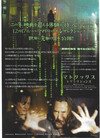 Mini-poster proveniente dal Giappone del film Matrix: Resurrections. Funge da volantino promozionale e viene distribuito nei cinema giapponesi durante la proiezione dei film. Sono oggetti da collezione che aumentano di valore col passare del tempo. Formato B5 (18 x 26 circa)