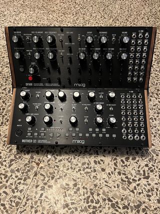 Laterali sintetizzatori Moog Mother 32, DFAM...