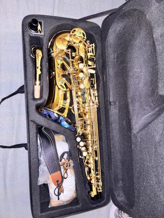 Sax contralto in ottime condizioni, utilizzato pochissimo. Usato praticamente 2 volte, completo di tutto. - Finitura dorata lucida. - Custodia rigida inclusa. - Tracolla regolabile.