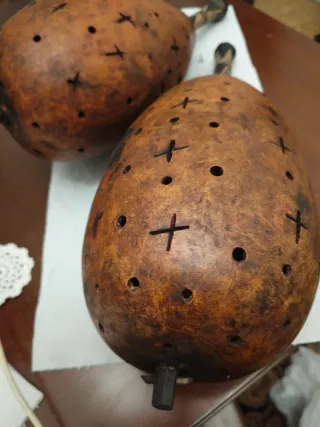 Coppia di maracas artigianali vintage, strumenti musicali a percussione originario del Sud America, tipicamente realizzare con zucche cave essiccate - Decorate con fori a forma di croce e puntini. - Manici neri con incisioni decorative.