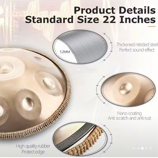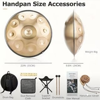 Handpan da 10 note in Re Minore Kurd, accordato a 440Hz. Strumento musicale dal suono evocativo. - Diametro: 55 cm (22 pollici) - Profondità: 24 cm (9.8 pollici) - Peso: 4 kg - Include borsa per il trasporto, panno per la pulizia, supporto, bacchette e manuale d'uso. - Finitura in ottone.