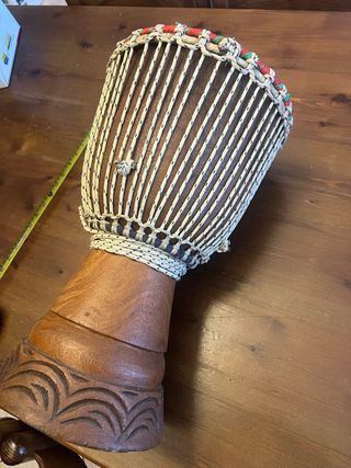 Bongo africano lavorato a mano con decorazioni uniche. Comprato in Senegal - Corpo in legno intagliato. - Finitura con corde e dettagli colorati.