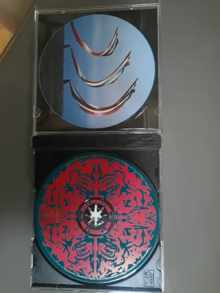 CD dei Pink Floyd con copertina e retro. - Immagine della copertina: tre amache contro un cielo blu. - Immagine del retro: disegno rosso e blu intricato.