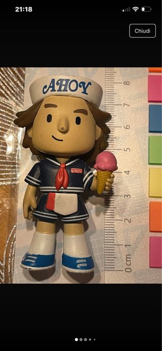 Action figure di Steve Harrington da Stranger Things, con il suo iconico outfit da Scoops Ahoy. - Cappello da marinaio con scritta Ahoy. - Uniforme da lavoro Scoops Ahoy con nome Steve sul petto. - Tiene in mano un cono gelato rosa.