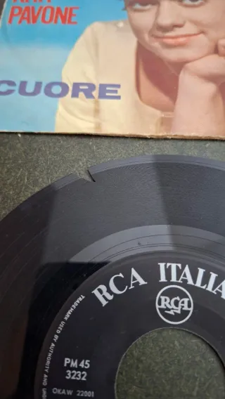Disco in vinile a 45 giri di Rita Pavone, con la canzone Cuore. Bordo rotto - Etichetta: RCA Italiana - Anno di pubblicazione: 1963 - Lato A: Cuore - Lato B: Il ballo del mattone
