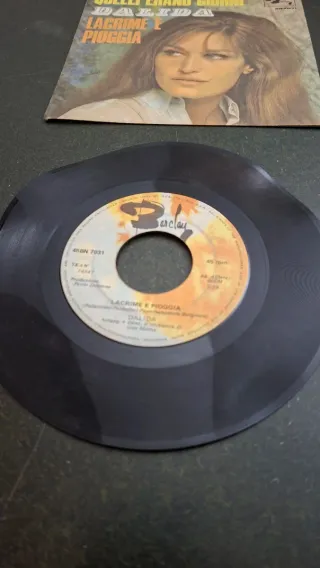 Disco in vinile a 45 giri con la canzone Lacrime e Pioggia di Dalida. Ondulato come in foto - Lato A: Lacrime e Pioggia - Lato B: Quelli erano giorni - Etichetta: Barclay - Codice: 45BN 7031 - Produzione: Paolo Dossena - Arrangiamento e direzione d'orchestra: Guy Motta