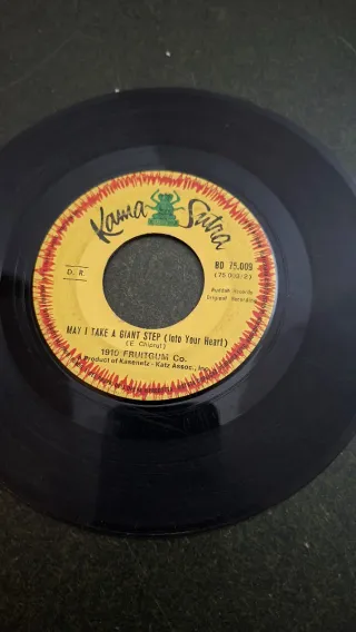 Disco in vinile da 45 giri con il brano May I Take A Giant Step (Into Your Heart) di 1910 Fruitgum Co. No copertina - Etichetta: Kama Sutra Records - Codice: BD 75.009 - Prodotto da Kassnetz-Katz Assoc., Inc.