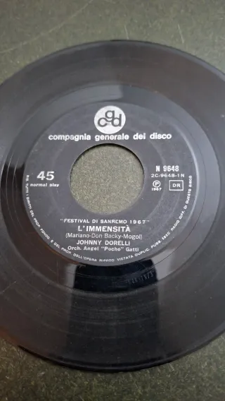 Disco in vinile 45 giri L'Immensità di Johnny Dorelli, presentato al Festival di Sanremo nel 1967. No copertina - Etichetta: Compagnia Generale del Disco - Anno di pubblicazione: 1967 - Brano: L'Immensità - Artista: Johnny Dorelli - Autori: Mariano-Don Backy-Mogol - Orchestrazione: Angel Pocho Gatti