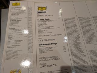 Due vinili di musica classica con opere di Richard Wagner (Ouverture e Preludi), Manuel de Falla (L'amore stregone) e Igor Stravinski (L'uccello di fuoco). - Richard Wagner: Ouverture e Preludi (I maestri cantori di Norimberga, Lohengrin, L'olandese volante, Tannhäuser, Parsifal) con la Vienna Philharmonic Orchestra diretta da Karl Böhm. - Falla e Stravinski: L'amore stregone / L'uccello di fuoco con Grace Bumbry, Orchestra Sinfonica della Radio di Berlino diretta da Lorin Maazel.