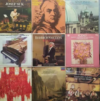 Collezione di vinili di musica classica. - Mozart: Josef Suk - Violino e Viola - Handel: Concerti Grossi Opus 3 - Mysliveček: Sinfonie - Schumann: Concerto per Pianoforte e Orchestra - Smetana: Má Vlast - Kodály: Peacock Variations, Galanta Dances, Marosszék Dances - Janáček: Sinfonietta, Taras Bulba - Dvořák: Sinfonia n. 9 Dal Nuovo Mondo - Tancoljunk csárdást! Danza il Csárdás! Sándor Déki Lakatos e la sua Gipsy Band I dischi sono perfetti, alcune copertine presentano segni d'uso