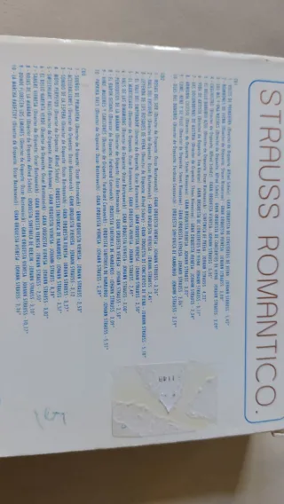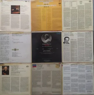 Dischi in vinile di musica classica. - Dvořák: Sinfonia N.9 Dal Nuovo Mondo, direttore: George Szell, orchestra: Cleveland Orchestra, etichetta: la Caixa. - Valzer di Chopin, Rubinstein. - Tchaikowsky: Il Lago dei Cigni, direttore: Arthur Fiedler, orchestra: Boston Pops. - Jose Carreras: Nella Cattedrale di San Patrizio, concerto di musica tradizionale di Spagna e Americhe. - Benjamin Britten, Paul Hindemith, Ottorino Respighi, English Chamber Orchestra, Enrique Garcia Asensio.