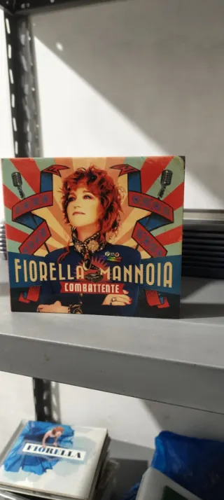 CD Combattente di Fiorella Mannoia. - Copertina con ritratto dell'artista. - Grafica ispirata a elementi retrò e musicali.