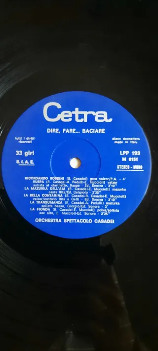 Disco in vinile Cetra Dire, Fare... Baciare con Orchestra Spettacolo Casadei. - Brani inclusi: Dire, Fare... Baciare, Bella Sportiva, Il Soldatino, L'Amor E' Una Bugia, Mare Adriatico, Lina. - Etichetta: Cetra. - Codice: LPP 193 M 8150. - Made in Italy. Solo per alcuni vinili, manca la copertina