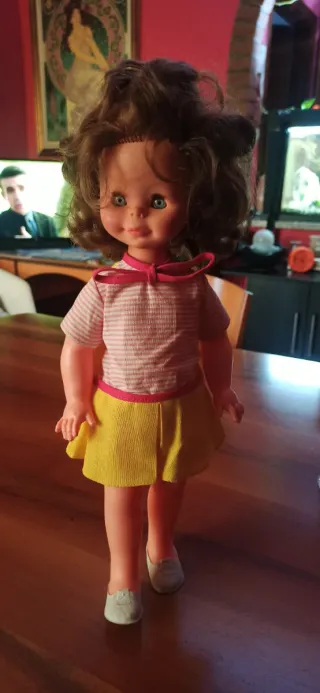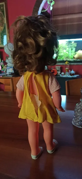Bambola vintage con un grazioso vestito. - Vestito a righe rosa e bianche con gonna gialla, il vestito dietro e un po' scucito - Fiocco rosso sul collo. - Scarpe bianche