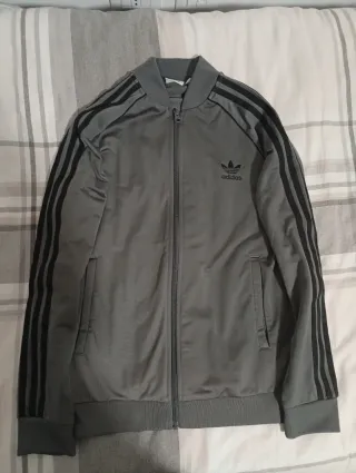 Giacca sportiva Adidas in tessuto tecnico, colore grigio con le iconiche tre strisce nere sulle maniche. - Logo Adidas ricamato sul petto. - Zip frontale. - Tasche laterali. - Polsini e fondo a costine.