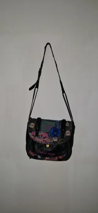Borsa a tracolla Desigual con un design unico e colorato. - Fantasia floreale e astratta. - Dettaglio fiore blu applicato. - Scritta I want a dream sul fondo.