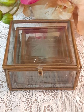 Set di tre scatoline in vetro, perfette per conservare piccoli oggetti o come elementi decorativi. - Vetro trasparente con finiture in metallo. - Design vintage a forma quadrata. - Una delle scatoline presenta un'incisione decorativa sul fondo. Vintagissimo set di scatoline mignon in vetro con bordo in ottone e decoro a stella. La più grande ha una crepa sul vetro davanti facilmente sostituibile. La più piccola ha la cerniera del coperchio dissaldata da un lato. Cmq set originale. Misura scatolina piu grande lati 7,5 cm altezza 4,5 cm. Misura scatolina più piccola lati 4,5 cm altezza 2 cm. art 12