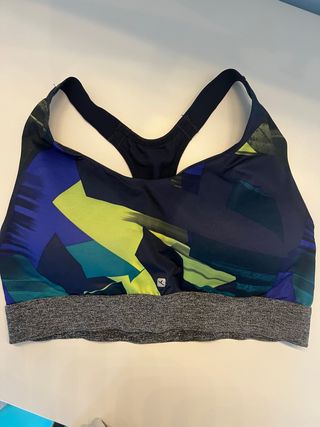 Reggiseno sportivo con un design astratto e vivace. Taglia S - Scollo a vogatore - Fascia elastica grigia sul fondo