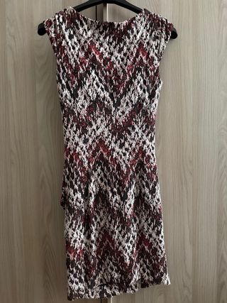 Elegante vestito corto con fantasia. - Scollo a V. - Maniche corte. - Tessuto leggero e drappeggiato.