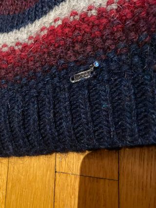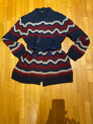 Elegante cardigan Cocca in lana e alpaca, perfetto per aggiungere un tocco di stile. - Design a zig-zag con fili rossi, beige e blu. - Cintura in camoscio blu, per una silhouette definita. - Maniche lunghe. - Chiusura aperta sul davanti.