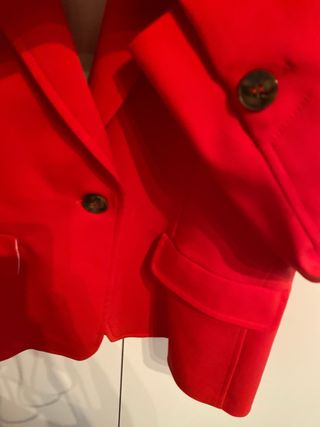 Elegante giacca monopetto EMME Marella abbinata ai suoi pantaloni originali, leggermente svasati sul fondo e con un originale cucitura sul retro. Ottima vestibilità, taglia 44 italiana corrispondente a una L. - Colore rosso vivace. - Taglio classico. - Chiusura con un bottone. - Pantaloni leggermente svasati