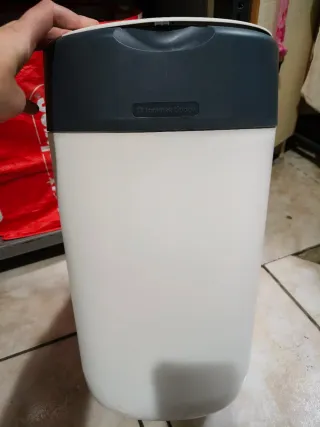 Contenitore Tommee Tippee per pannolini. Design moderno e pratico. - Colore bianco e grigio scuro. - Logo Tommee Tippee visibile.