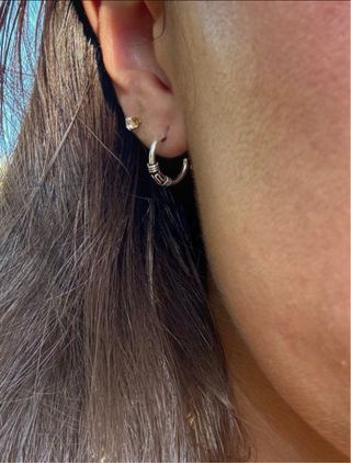 Orecchini lavorati a cerchio in argento testato. Nuovi.