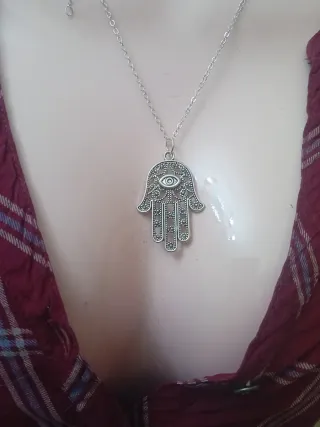 Collana in acciaio con ciondolo a forma di mano di Fatima con occhio. - Materiale: acciaio. - Design: mano di Fatima con occhio.