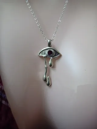 Collana con ciondolo a forma di occhio di Fatima. Il design è in acciaio con un dettaglio rosso al centro. - Ciondolo a forma di occhio. - Dettaglio centrale rosso. - Catena in acciaio.