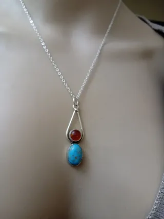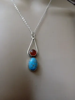 Delicata collana con pendente in argento. - Pietra centrale color turchese. - Dettaglio superiore color ambra. - Catena in acciaio