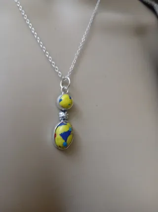 Collana con pendente in argento e acciaio, caratterizzata da pietre turchesi e gialle. - Design unico con pietre colorate. - Montatura in argento e acciaio.